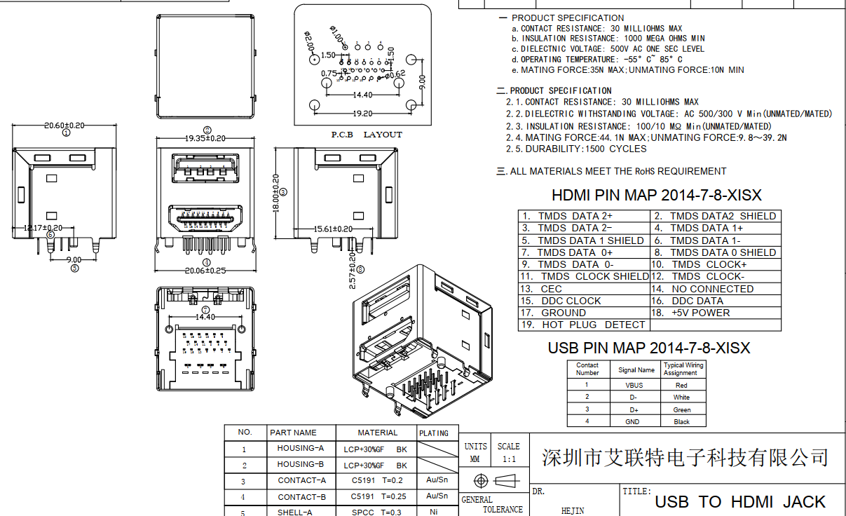 HDMI+USB母座 雙層USB+HDMI二合一母座 四腳全插