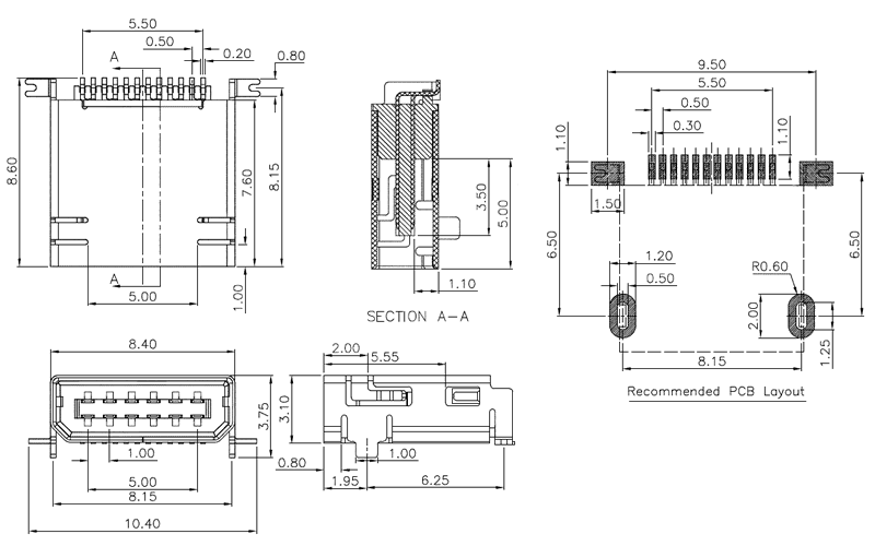 MINI USB 10P母座 三星款 板上前插后貼 無柱