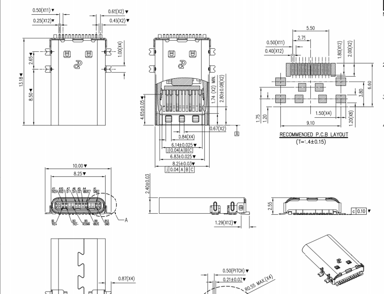 TYPE C 12P公頭 板上四腳全貼帶接地腳 針單排SMT