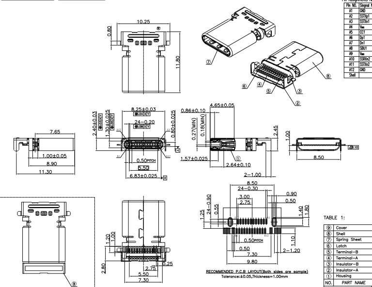 TYPE C 24P公頭 沉板四腳前貼后插 雙排針貼片SMT