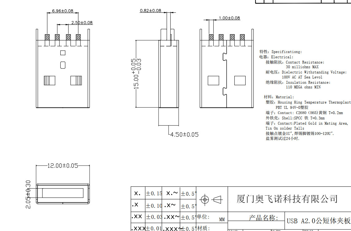 USB 2.0公頭 180度立插公頭 夾板式 帶夾板腳 可插板可夾板