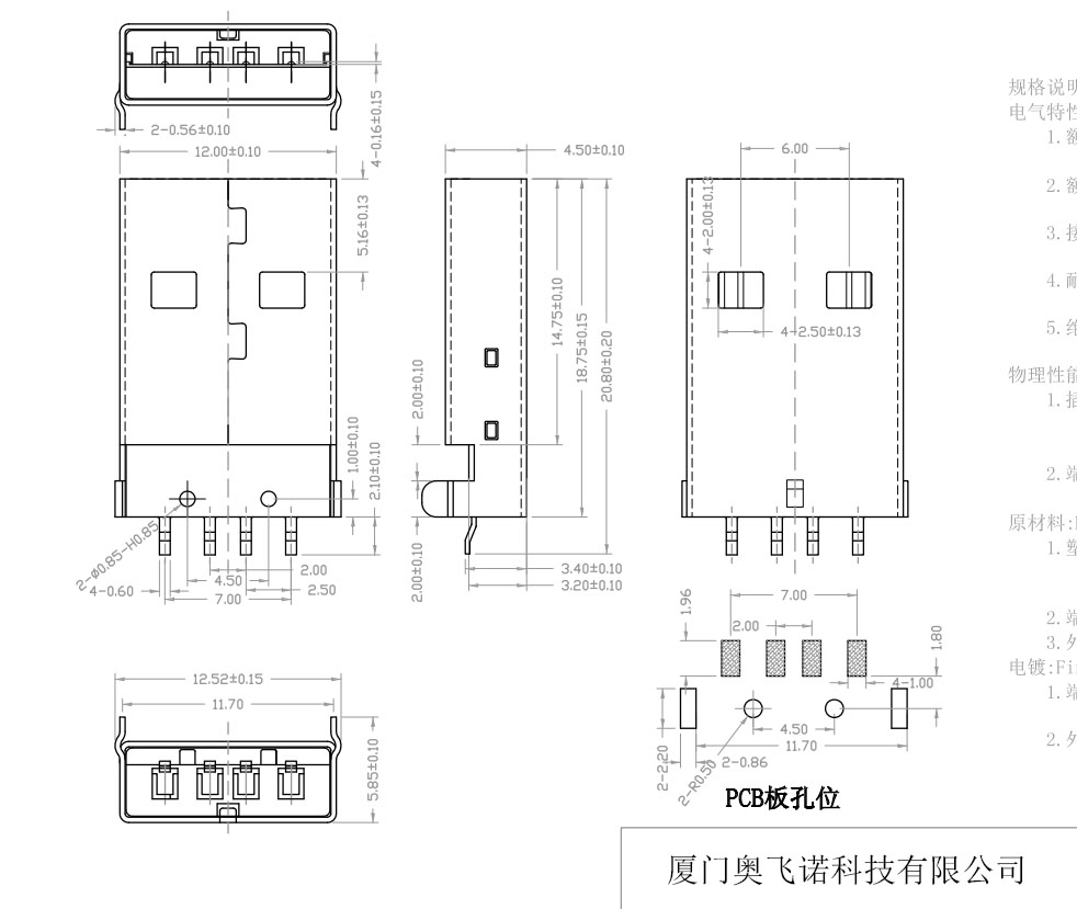 USB 2.0公頭 AM180度貼片 沉板彎腳黑膠 模頂