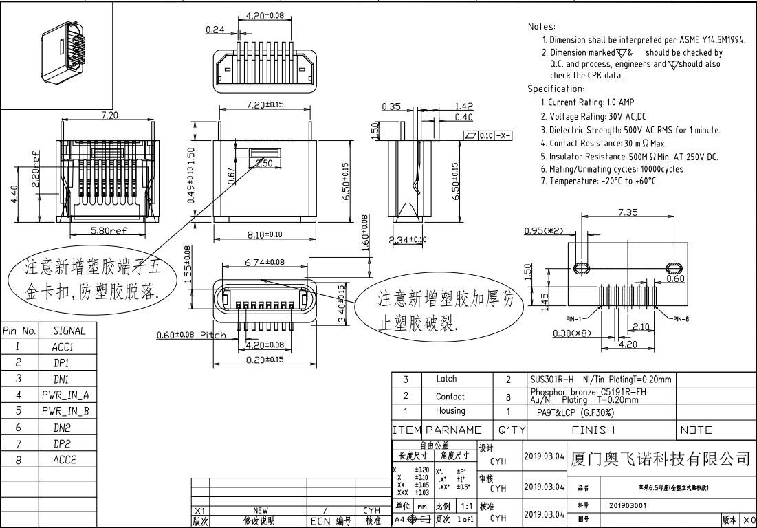 蘋果8P母座 6.5H立貼iPhone母座 帶插腳 有蓋黑膠