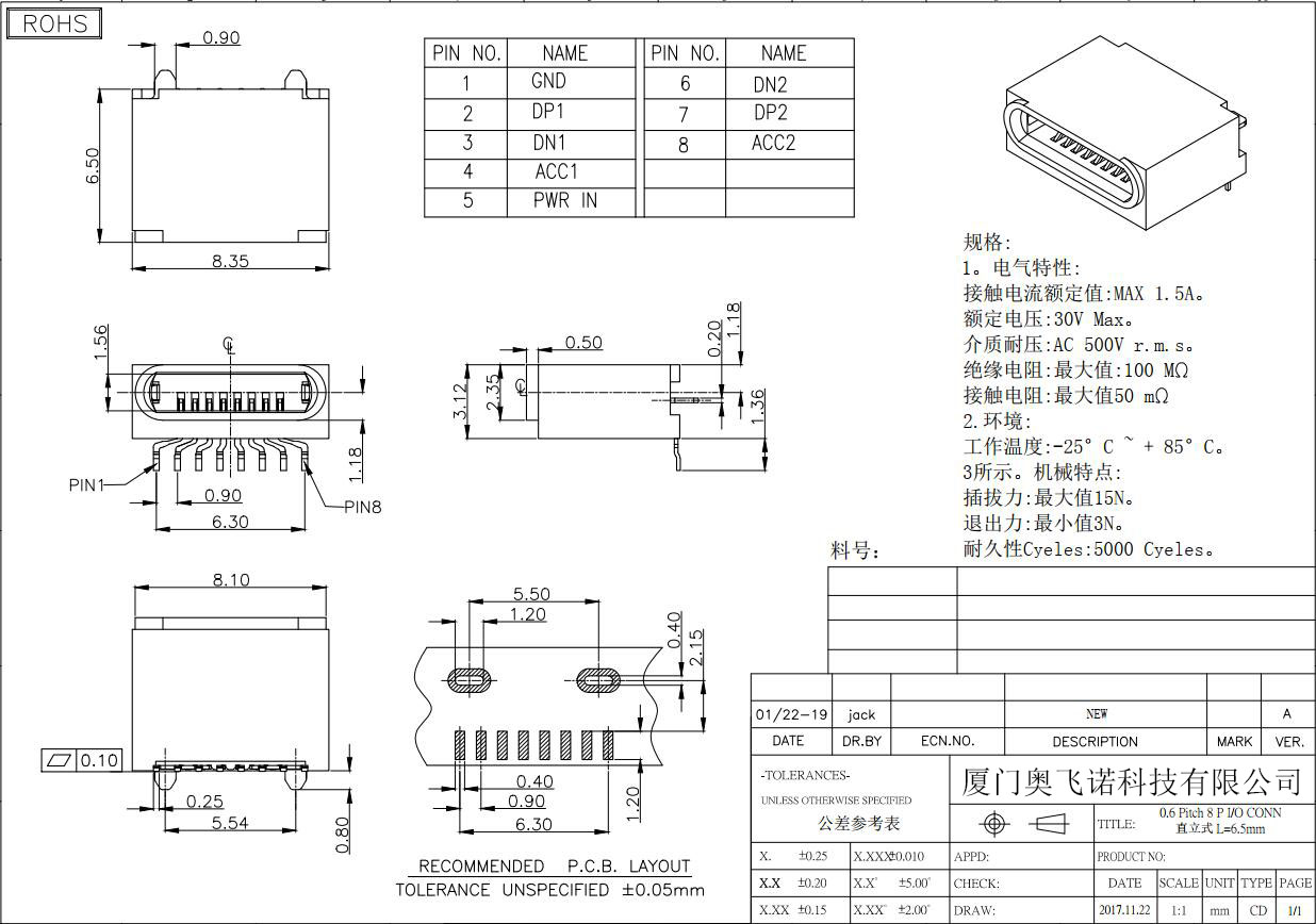 蘋果8P母座 180度立貼母座 大間距PIN針 帶插腳